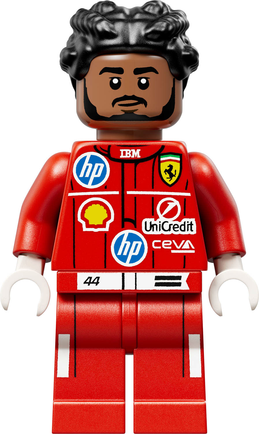 It includes a Lewis Hamilton minifigure in his red Scuderia Ferrari HP racing suit.
