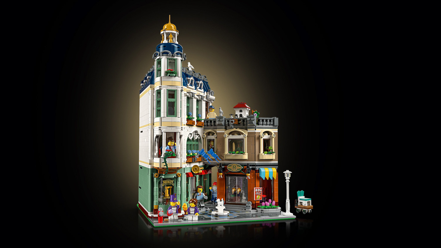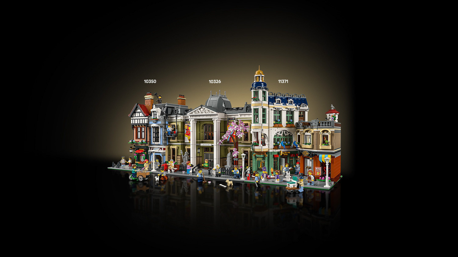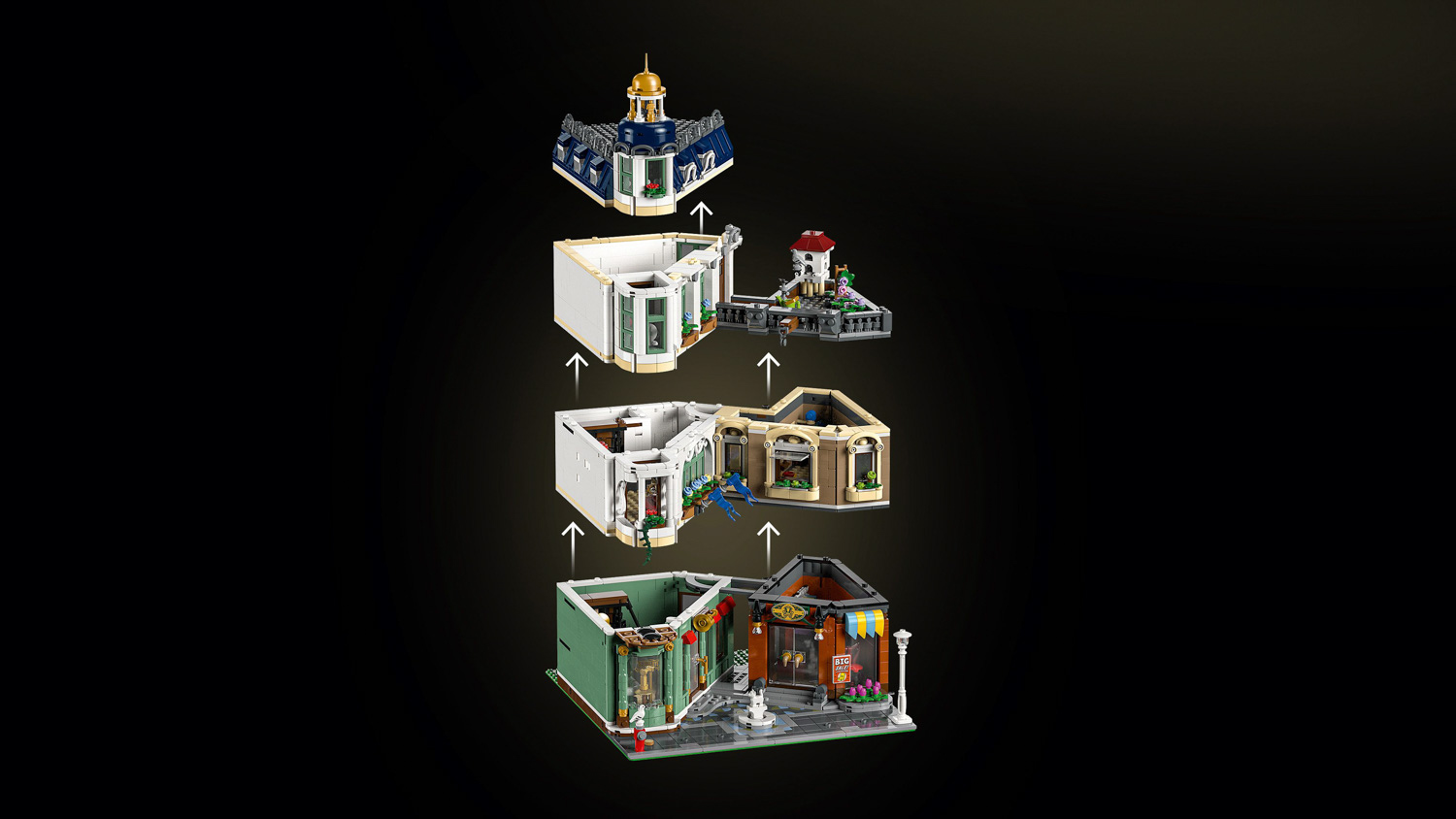 Inspired by European architecture, the LEGO Icons Shopping Street features angled walls, ornate facades and a central plaza.