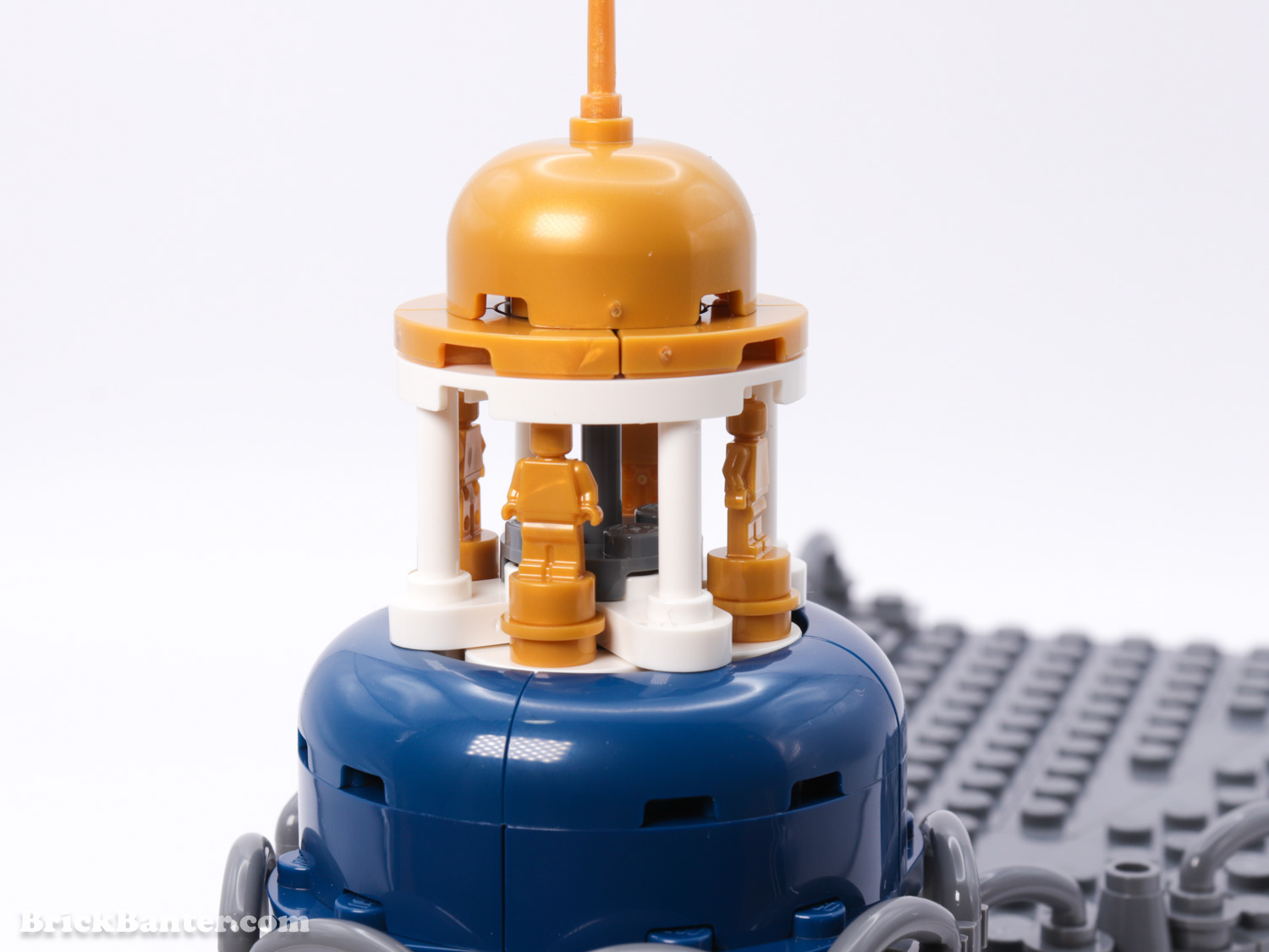 The final section to the model is the capping roof, which uses a newer element in a unique way. If anyone has gotten the f1 Collectible ‘Minifigure’ Series, the new rounded bar element isn’t new. But what is great here is how LEGO have used it. Not only did they use it for the small detailed barrier on the top, but also for the details above the windows. The used this element with feather plumes for continue the rounded shape, and I love it.