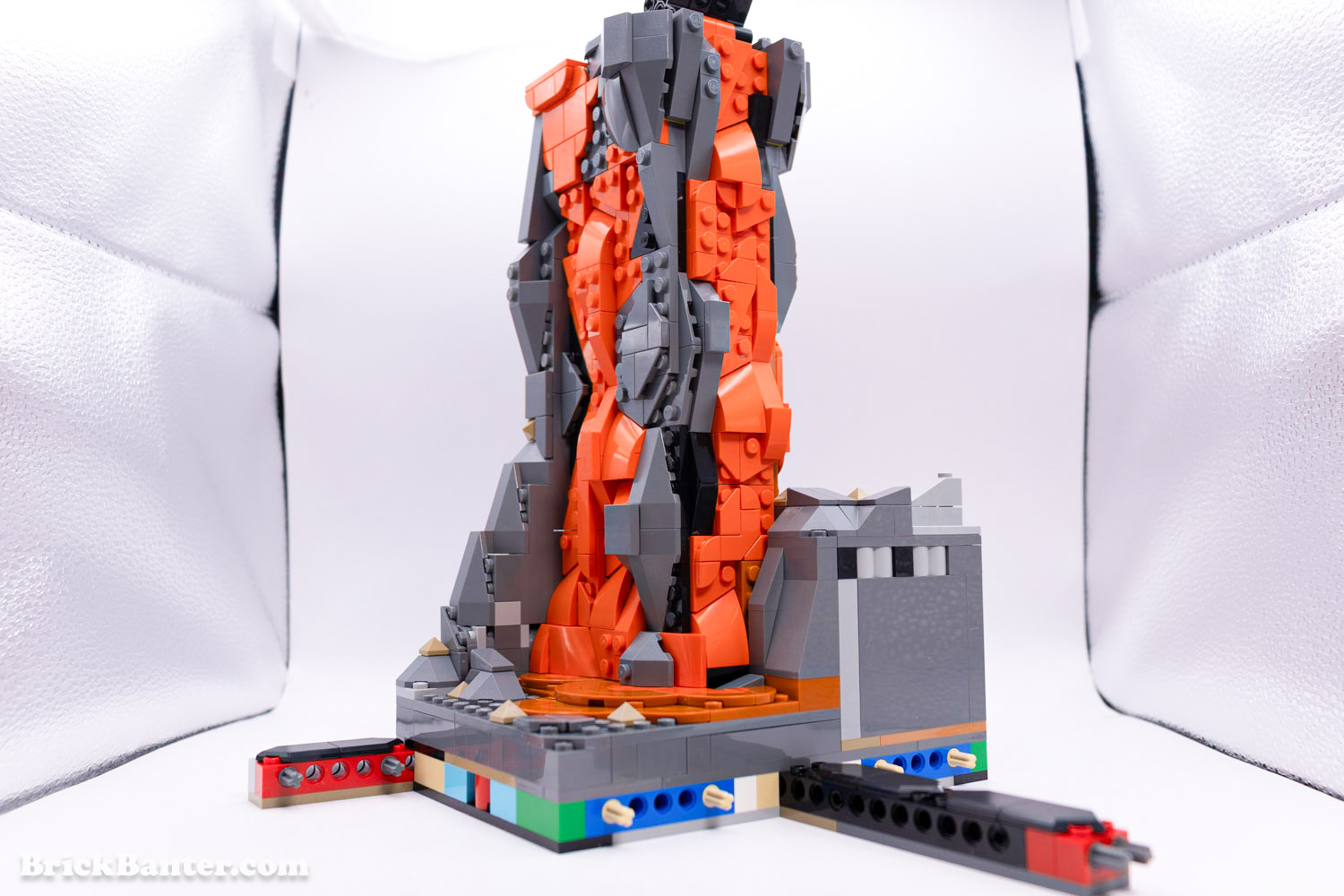The stand for LEGO Pokémon Charizard is a monolithic style tower spewing lava from inside. The orange used is the new darker orange, which makes nice for a colour contrast between the bright orange of Charizard. The problem with such as a stand is the fact that it can’t be displayed on its own. It exists as an integral joining point between the two other display bases, but unfortunately exposes technic and mismatching colours underneath.