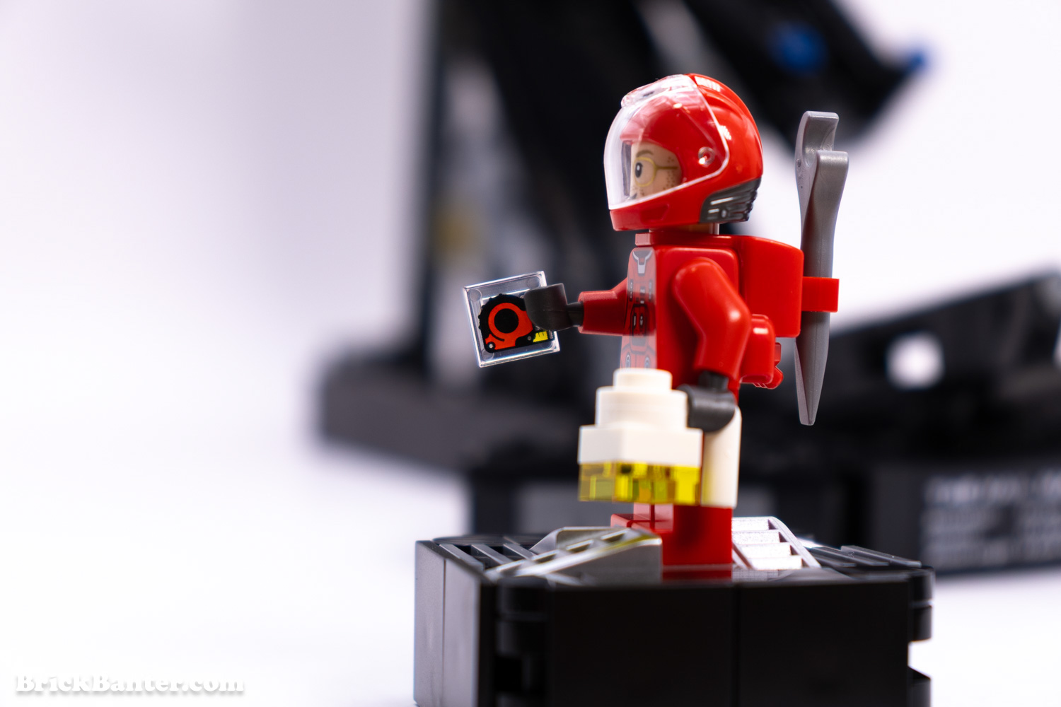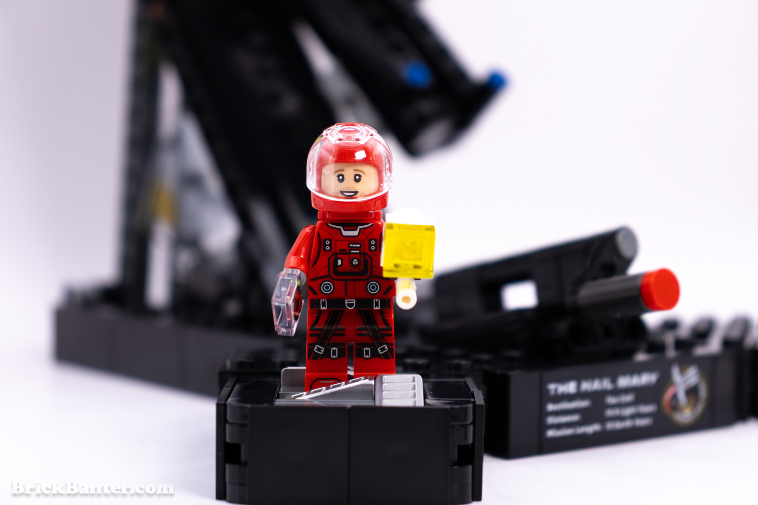 The LEGO minifigure for this set is Ryland Grace, otherwise our first appearance of Ryan Gosling as a figure. We get two faces that we can use – one with glasses and one without. The figure is also incredibly detailed over the torso and legs, and feels really high quality. The helmet, to my understanding, is also exclusive in this colour here. Ryland also has a scanner for an accessory, as well as a printed 1×1 tile tape measure element.