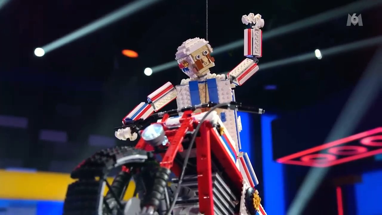 Looking to keep themselves in the game they opt to create a stuntman who’s jumping through a hoop of fire. The judges come by and note that getting the feeling of motion is key and challenges them to have a spinning rear wheel to give the effect it’s left the ground. The wheel spins and earns points from the judges. Paulina notes that there are some issues with the build consistency. There’s a mix of angles and curves and the wheels are more of a hexagonal shape. George gives points for them achieving what was seen to be as ambitious, namely the success of having the rider be off the bike, but there are a few proportion issues.