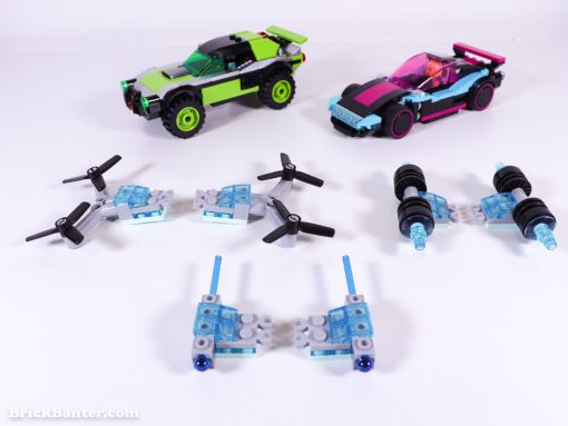 Much like the other vehicle set before, the cars have the double bar piece on the sides to be able to attach the play features of the set, which represents some of the power-up gimmicks that come from the 2k Drive game. Choose between rockets, rotors or spring-loaded shooters and drive your customised car to heart’s content!